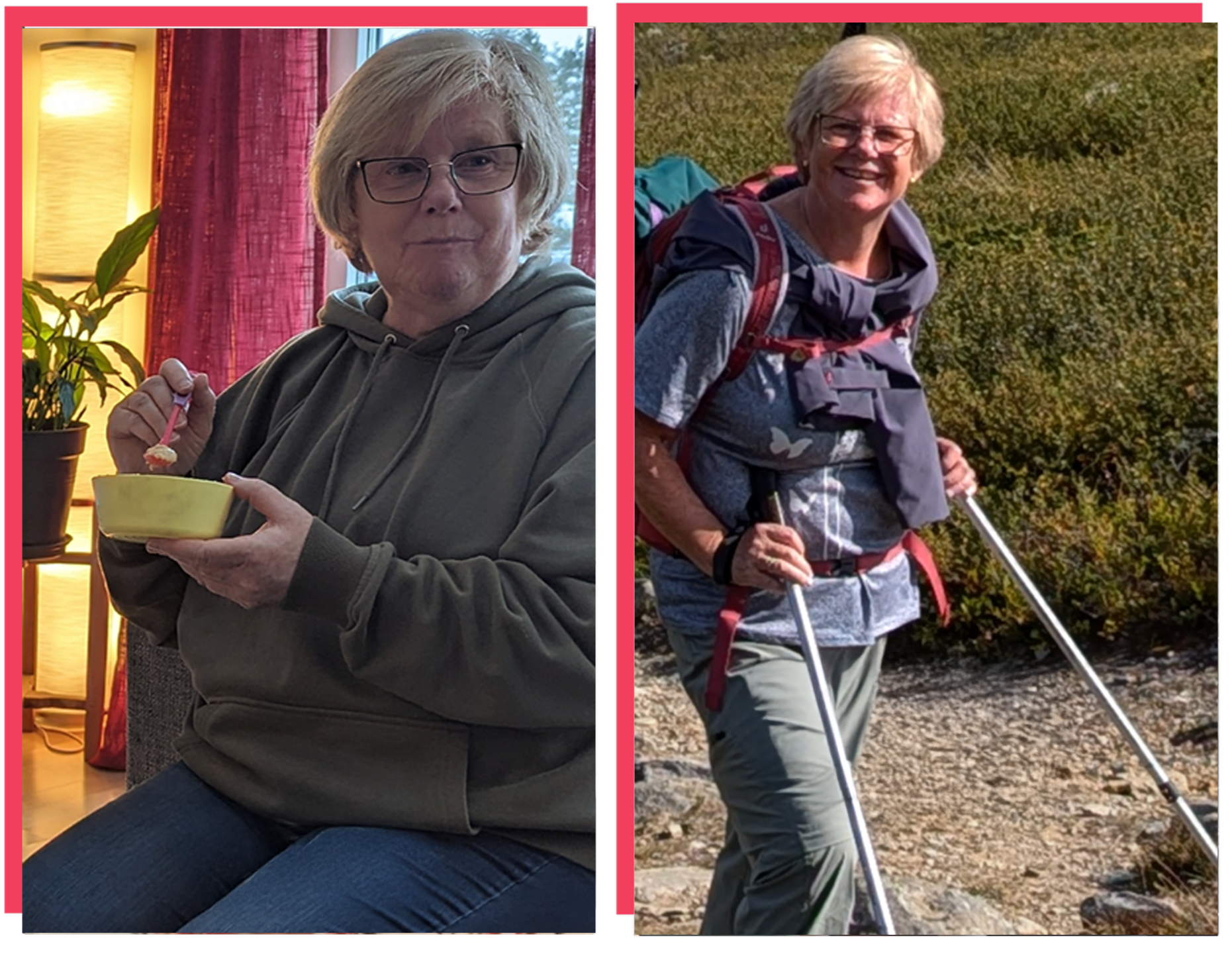 "I dag 17 kg lettere og kjenner en stor takknemlighet for kursing, oppmuntrende ord, veiledning og gode samtaler. Jeg er i mål, men nå starter jobben med å bevare de gode vanene, beholde vekta og fortsette reisen med å ta vare på meg selv."